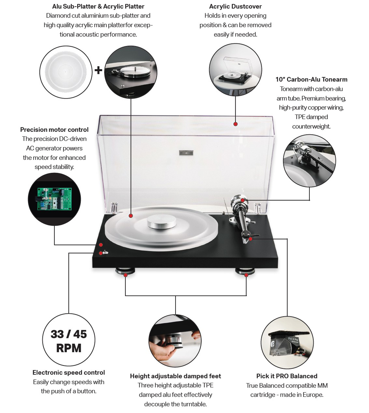 Med 10" hybrid tonearm, akryltallerken, aluminium sub-platter og Pick it PRO Balanced pickup er dette en modell som er bygget for seriøs lytting – samtidig som den er enkel å leve med i det daglige.