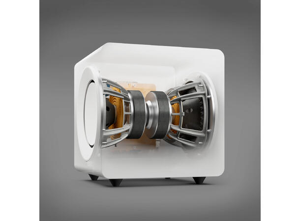 De to basselementene er plassert, rett mot hverandre, så de utkanselerer hverandres vibrasjoner selv opp i lydtrykk opp til 110dB, og dette fra et så lite kabinett.