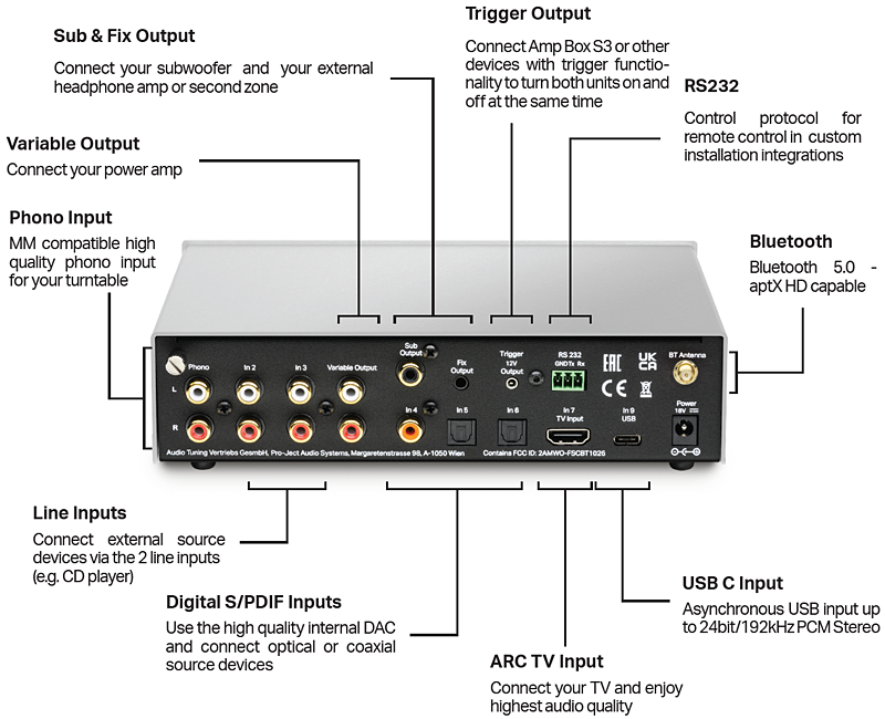 MM-RIAA (45 dB), hodetelefonutgang 6,3 mm og Bluetooth 5.0 med aptX HD gjør Pre Box S3 til en komplett allrounder i S3-format.